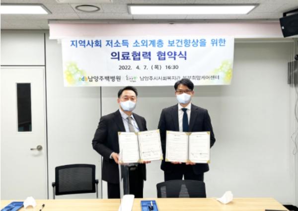 [한국뉴스타임=편집국] 남양주시 북부희망케어센터(센터장 전정수)는 지난 7일 ndb남양주백병원(병원장 최선종, 강진호)과 지역사회 저소득계층의 보건 향상을 위한 업무 협약을 체결했다.