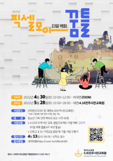 [한국뉴스타임=편집국] 4.16민주시민교육원이 13일부터 선착순으로 도내 청소년 자녀를 둔 가족을 대상으로 ‘타일 벽화 픽셀 모아 꿈틀’ 참여 신청을 받는다.