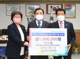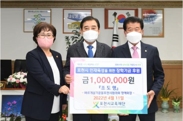 [한국뉴스타임=편집국] 바르게살기운동 포천시협의회 조도행 명의회장은 지난 11일 (재)포천시교육재단(이사장 박윤국)에 장학금 1백만 원을 기탁했다.