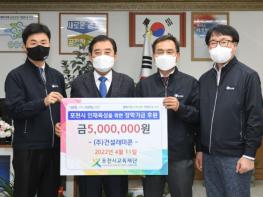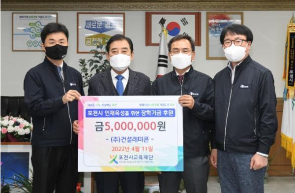 (재)포천시교육재단(이사장 박윤국)은 지난 11일 ㈜건설레미콘(대표 이미성)에서 장학기금 5백만 원을 기탁했다고 밝혔다.