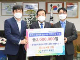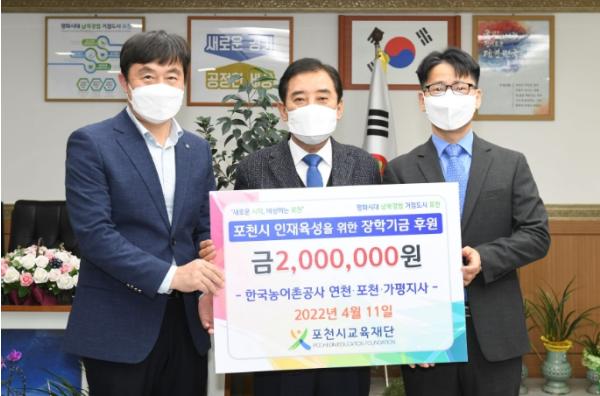 (재)포천시교육재단(이사장 박윤국)은 지난 11일 한국농어촌공사 연천·포천·가평지사(지사장 홍성갑)에서 장학기금 2백만 원을 기탁했다고 밝혔다.