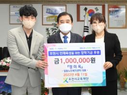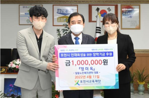 (재)포천시교육재단(이사장 박윤국)은 지난 11일 일동노인복지센터 정미옥 대표로부터 장학금 1백만 원을 기탁했다고 밝혔다.