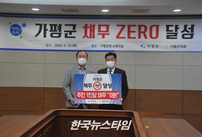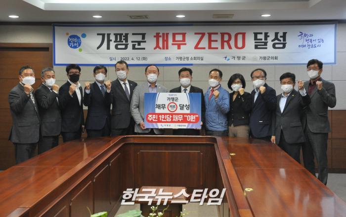 [한국뉴스타임=가평] 12일 김성기 가평군수와 가평군의회 배영식 군의장 및 의원들은 ‘가평군 채무 제로(ZERO) 달성 선포’을 하였다.