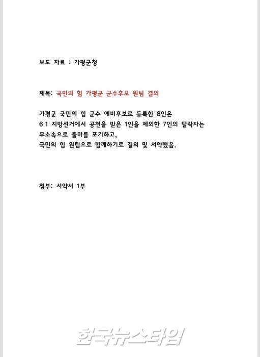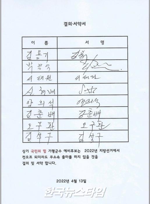 14일 국민의힘 가평군수 예비후보 8명 전원이 서명한 가운데 “가평군 국민의힘 군수 예비후보로 등록한 8인은 6.1 지방선거에서 공천을 받은 1인을 제외한 7인의 탈락자는 무소속으로 출마를 포기하고, 국민의힘 원팀으로 함께하기로 결의 및 서약”하였다.