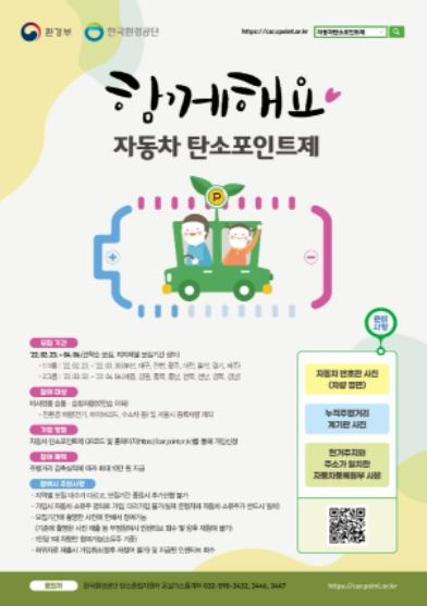 자동차 탄소포인트제의 추가모집은 31대로 1인당 1대 차량만 참여할 수 있고 감축률 40% 또는 감축량 4,000km 이상 달성하면 최대 10만 원의 인센티브가 지급된다.