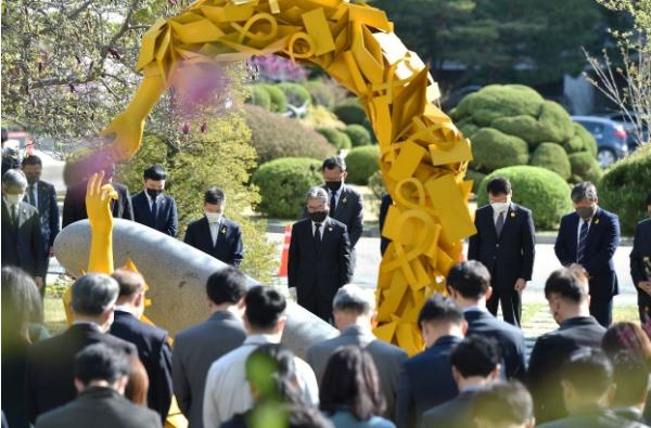 이재정 교육감은 헌화를 마친 뒤 도교육청 남부청사로 이동해 세월호 조형물 앞에서 직원들과 함께 희생자들을 기리는 추모식에 참석했다.