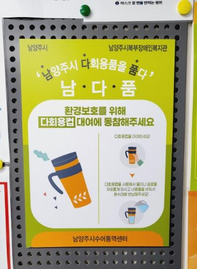 특히, 남양주시북부장애인복지관에서 운영 중인 남·다·품 대여소는 처음에는 이용이 저조했으나 점차적으로 이용자가 늘어 현재는 복지관을 이용하는 장애인, 가족, 지역 주민들이 다회용컵 사용에 적극 동참하고 있다. 남양주시북부장애인복지관은 올해 하반기에 층마다 컵 소독기를 설치해 남·다·품 대여소를 확대 운영할 계획이다.