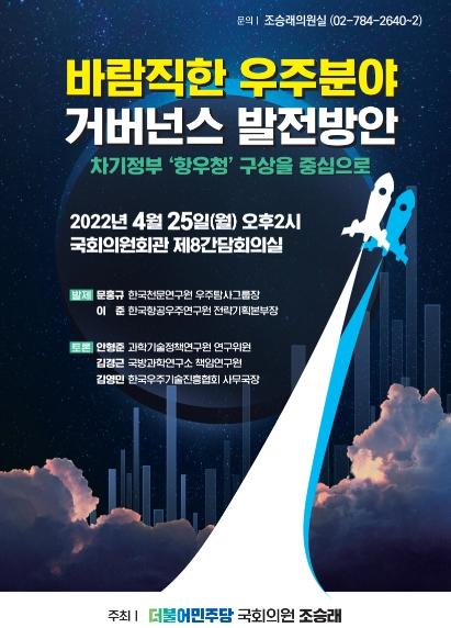 [한국뉴스타임=편집국] 국회 과학기술정보방송통신위원회 소속 조승래 더불어민주당 의원(대전 유성구갑)은 오는 25일 국회의원회관 제8간담회의실에서 ‘바람직한 우주분야 거버넌스 발전방안 : 차기정부 항우청 구상을 중심으로’토론회를 개최한다.