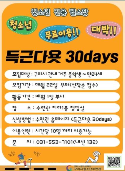 구리시청소년수련관이 운영하는 청소년 참여 주도형 프로그램 ‘득근다욧 30days’는 지역 청소년들의 체력 단련과 건전한 체육문화 공간 제공을 위하여 기존 성인 위주의 헬스장 대신 청소년이 스스로 자율적으로 운동을 계획하고 진행할 수 있도록 만든 프로그램이다.