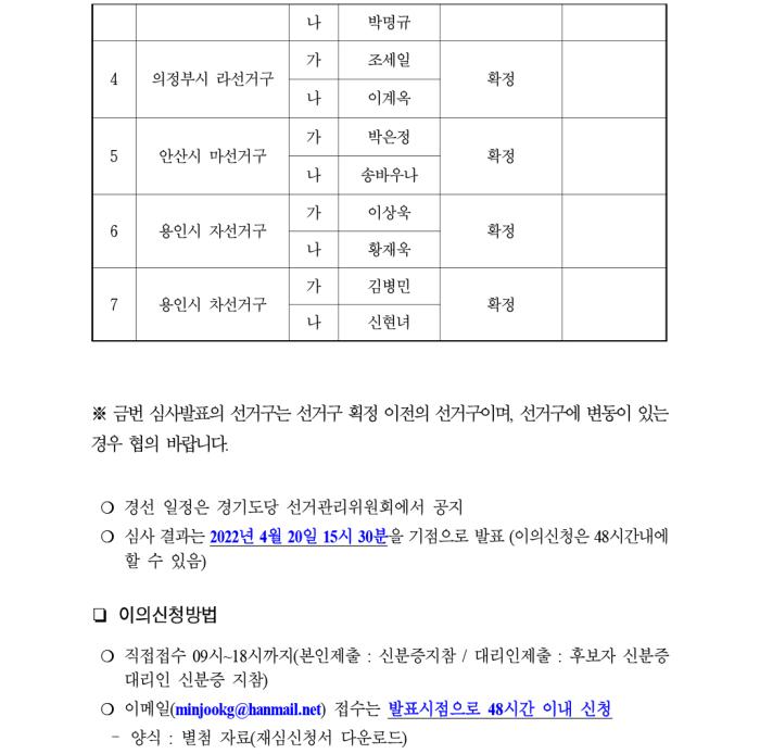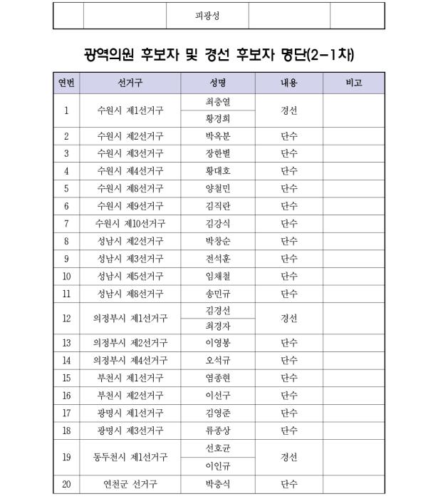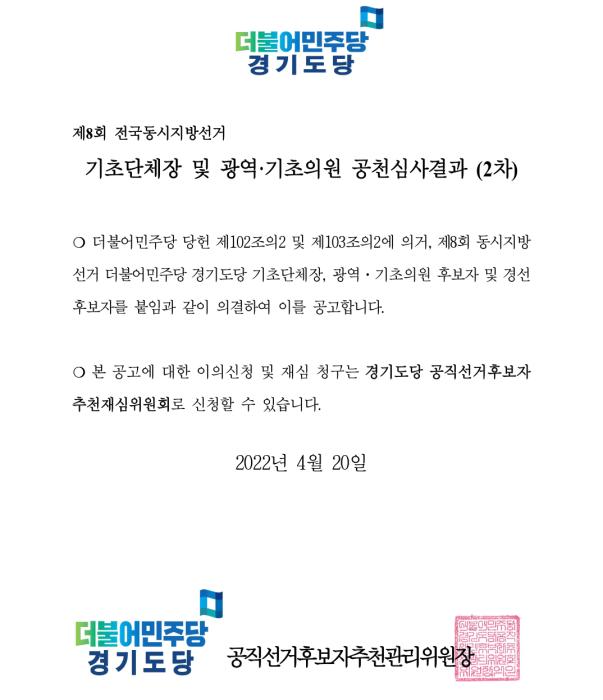 더불어민주당 경기도당은 20일 오후 6.1지방선거 기초단체장 및 광역·기초의원 2차 공천심사 결과를 발표하였다.