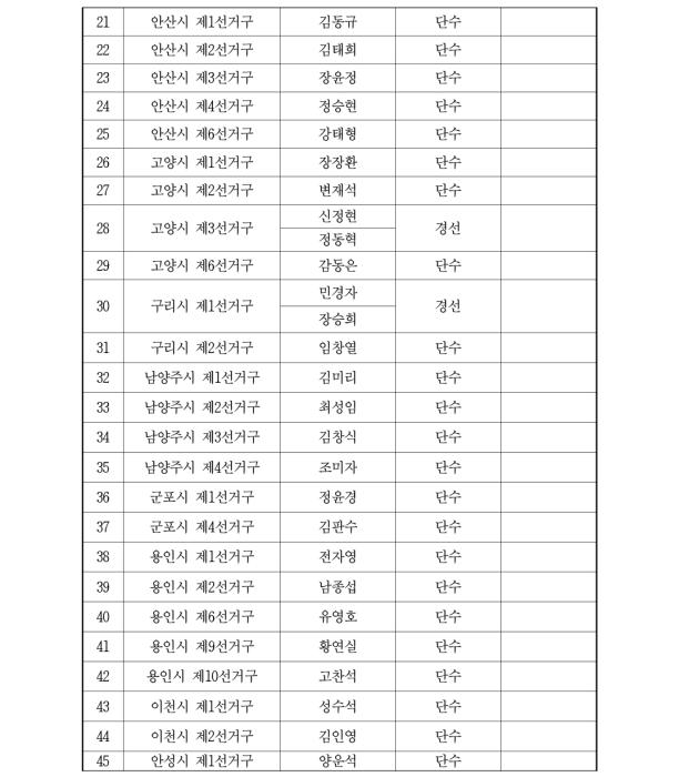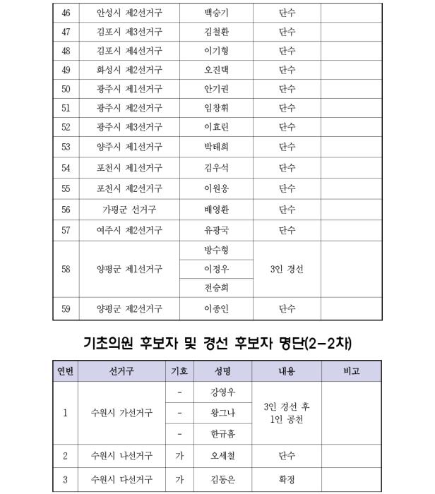 또한 경기도의원 민주당 후보는 제1선거구 김우석, 제2선거구 이원웅 현 도의원이 단수 공천되었다.