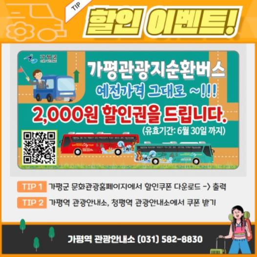 [한국뉴스타임=편집국] 가평군은 예전가격 그대로 할인된 금액으로 관광지 순환버스를 이용할 수 있는 요금 할인 이벤트를 운영한다고 밝혔다.
