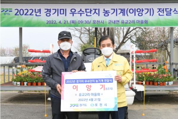 포천시는 지난 2017년부터 매년 경기미 품질향상에 기여도가 높은 지자체로 선정되는 쾌거를 올렸다. 올해 역시 경기미 우수단지로 선정되어 군내면 유교2리 마을회에 6조식 승용이앙기 1대를 지원했다.