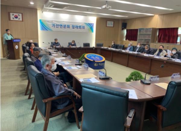 [한국뉴스타임=편집국] 대한노인회 가산면분회(분회장 이용근)는 지난 21일 각 경로당 노인회장 등이 참석한 가운데 가산면행정복지센터에서 4월 정례회의를 개최했다.