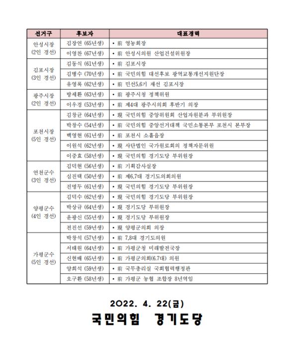 국민의힘 경기도당 공천관리위원회(위원장 김성원 국회의원)는 22일 오후 ‘제8회 전국동사지방선거 경기도장 공천관리위원회 1차 발표’를 통해 기초단체장 경선지역 및 경선후보자 등을 일부 확정했다.
