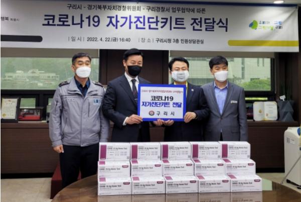 구리시(시장 안승남)는 22일 구리시청 3층 민원상담실에서 일선에서 대민업무를 수행하는 자치경찰을 위해 코로나19 신속 항원 진단키트를 구리경찰서에 전달했다.