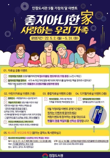 5월 한 달간 '좋지 아니한家-사랑하는 우리가족'이라는 주제 아래 부모교육특강, 도서관별 이벤트, 전시 등 전 계층의 시민이 참여할 수 있는 다채로운 독서문화행사를 인창/토평/작은 도서관에서 운영한다.