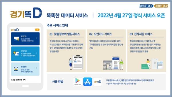 경기똑D에서는 ▲도민을 위한 복지정보와 공개채용정보 등 ‘맞춤수혜정보 서비스’ ▲공공마이데이터 기반의 본인 확인서비스인 ‘도민카드’ ▲다양한 전자증명서를 휴대폰에서 보관하고 활용할 수 있는 ‘전자지갑’ 서비스를 제공한다.