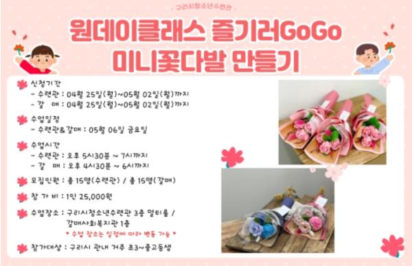 [한국뉴스타임=편집국] 구리시청소년재단은 5월 '원데이클래스 즐기러GoGo ? 나만의 아이템 만들기' 프로그램인 ‘미니꽃다발 만들기’를 구리시청소년수련관과 갈매행정복지센터에서 2원으로 운영한다.