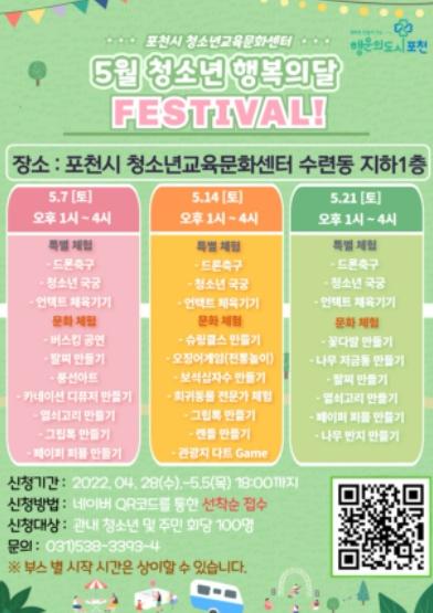 5월 청소년 행복의 달 행사는 포천시 청소년 자치기구 청소년들의 자발적인 참여를 통한 사회적 참여활동 기회의 제공과 주도적인 역량을 키울 수 있는 기회를 마련하고, 관내 청소년 및 주민들의 관심사를 충족시킬 수 있을 것으로 기대된다.