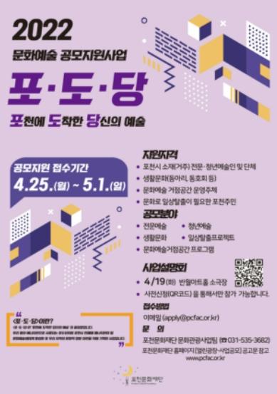 [한국뉴스타임=편집국] 재단법인 포천문화재단(이사장 박윤국)이 포천시민과 예술인의 문화예술활동을 지원하는 2022년 ‘포천에 도착한 당신의 예술’ 공모사업을 추진한다.