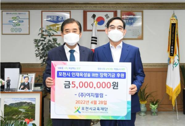 (재)포천시교육재단(이사장 박윤국)은 지난 28일 ㈜이지필림(대표이사 이종광)에서 장학기금 5백만 원을 기탁했다고 밝혔다.