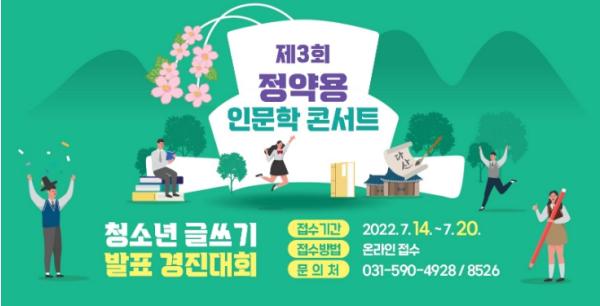 ‘정약용 인문학 콘서트’는 시 대표 문화유산인 정약용 선생의 학문 정신을 현대적으로 계승하고자 하는 취지로 마련된 청소년 인문학 경진대회로, 전국 14세부터 19세까지의 청소년이 참가해 에세이 글쓰기와 발표 경진대회를 진행한다.