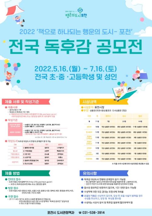 [한국뉴스타임=편집국] 포천시는 지난 1월부터 4월까지 ‘2022년 책으로 하나 되는 행운의 도시 포천 올해의 책’을 시민투표로 6권을 선정하고, 올해의 책으로 전국 독후감 공모전을 개최한다.