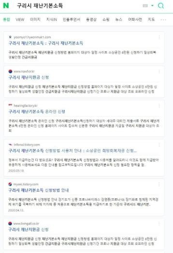 그러나, 현재 포털사이트 네이버에서 “구리시 재난기본소득”을 검색하면 “휴대폰 분실 보호 이용 서비스” 등을 유도하는 광고가 표시되는 가짜사이트가 나타났다.