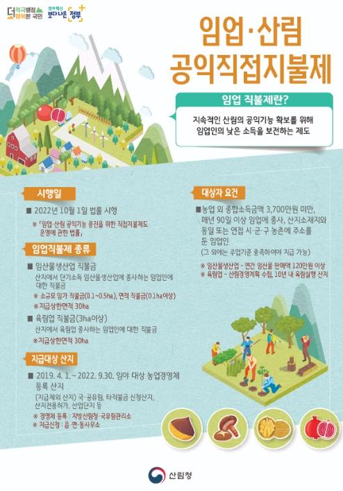 직불금 신청은 6월부터 각 읍·면 행정복지센터에서 접수받을 예정이며, 지급대상은 2019년 4월 1일부터 2022년 9월 30일까지 임업경영체에 등록이 완료된 산지이다. WTO 협정에 따라 2022년 10월 1일 기준으로 해당기간 등록이 유효하지 않은 산지는 직불금 지급대상 산지에서 영구히 제외되므로, 반드시 해당 기간 내에 등록을 완료하여야 한다.