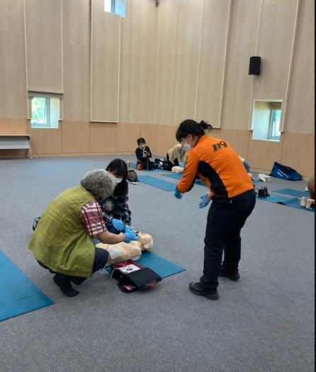 구리시소방서 전문 강사가 실제 응급상황 발생 시 신고요령, 심폐소생술(CPR)방법, 자동심장충격기(AED) 사용법 등 이론과 실습을 병행하고, 교육생들은 마네킹을 활용하여 심폐소생술을 직접 실습한다.