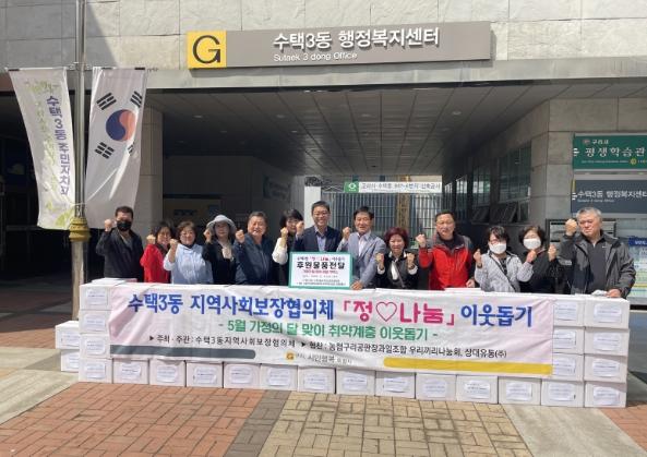 [한국뉴스타임=편집국] 구리시는 4일 수택3동 지역사회보장협의체(민간위원장 이영행)가 주관으로 5월 가정의 달을 맞아 관내 저소득 한부모가정 및 독거어르신을 위한 '정♡나눔 이웃돕기' 전달식을 개최했다.