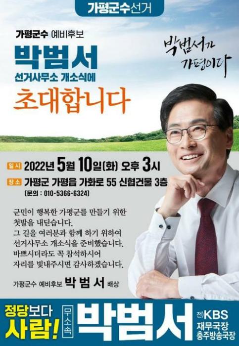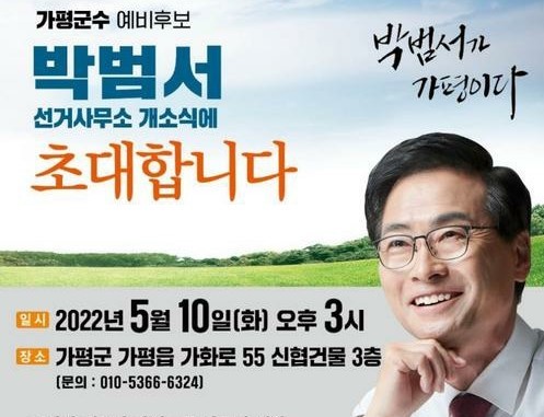 [한국뉴스타임=가평] 무소속 박범서 가평군수 예비후보가 다음주 5월 10일 오후 3시 선거사무소 개소식을 개최한다.