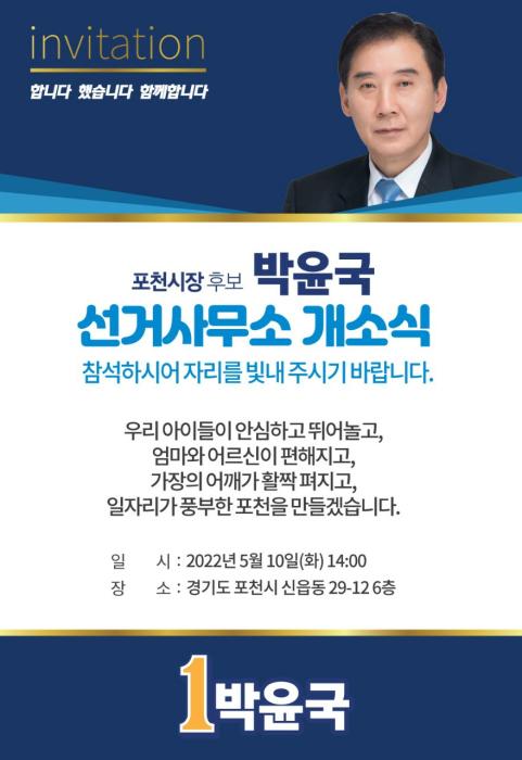 [한국뉴스타임=편집국] 박윤국 포천시장 예비후보는 오는 5월 10일(화) 14시에 포천시 신읍동 29-12 6층에서 선거사무소 개소식을 개최한다.