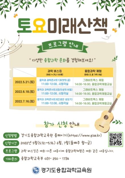 경기도융합과학교육원(원장 이태헌)이 12일부터 도민 대상으로 융합과학 교육 문화 확산을 위한 ‘토요미래산책’ 참가 신청을 받는다.