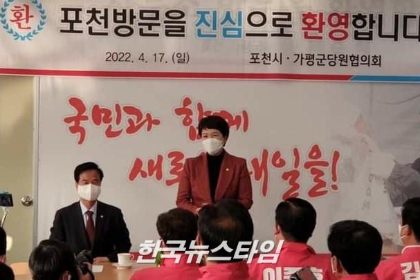 | (지난달 17일 포천시를 방문하여 김은혜 경기지사 후보는 국민의힘 포천가평당원들과 간담회를 개최하였다.) |