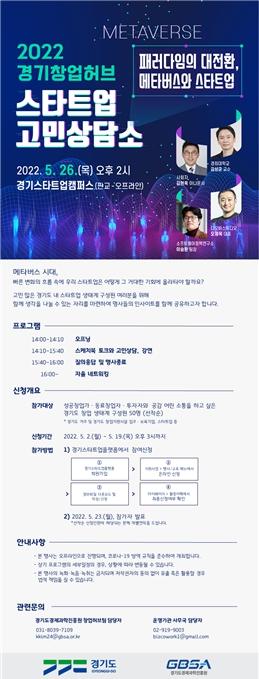 경기도는 오는 26일 오후 2시 성남 판교 경기스타트업캠퍼스에서 ‘2022 경기창업허브 스타트업 고민상담소’를 개최한다고 밝혔다.