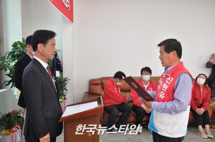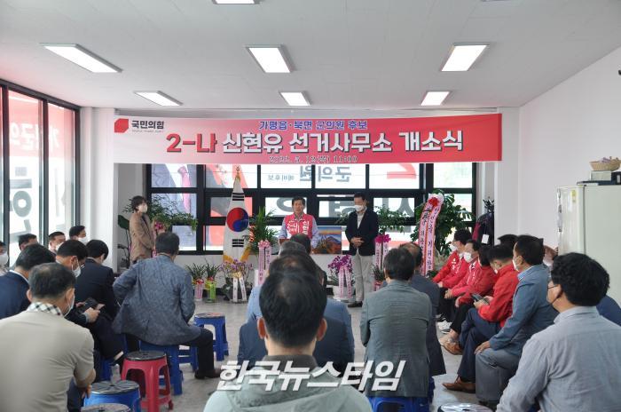 [한국뉴스타임=보도국] 12일 오전 6.1지방선거 가평군의원 가선거구(가평.북면) 국민의힘 나번에 출마한 신현유 군의원 후보가 선거사무소 개소식을 개최하였다.