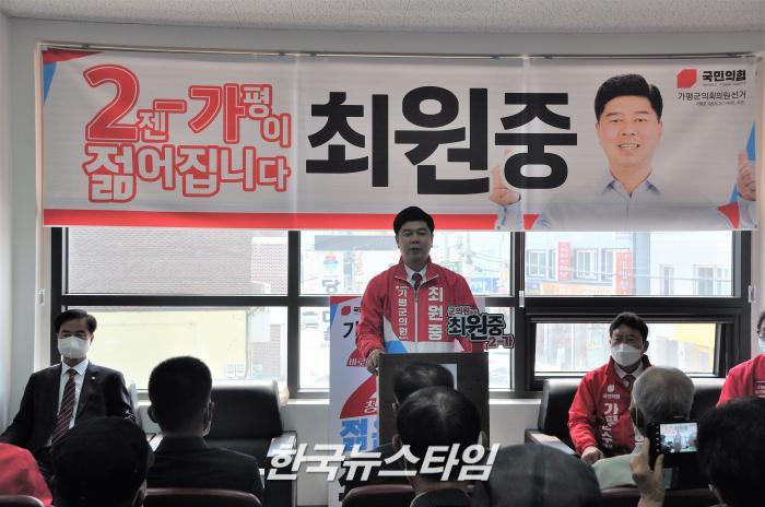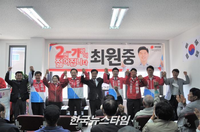 [한국뉴스타임=보도국] 12일 오전 6.1지방선거 가평군의원 가선거구(가평.북면) 국민의힘 가번에 출마한 최원중 군의원 후보가 선거사무소 개소식을 개최하였다.