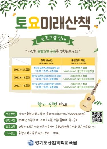 경기도융합과학교육원(원장 이태헌)이 12일부터 도민 대상으로 융합과학 교육 문화 확산을 위한 ‘토요미래산책’ 참가 신청을 받는다.