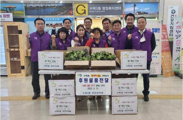 [한국뉴스타임=편집국] 구리시는 수택3동 주민자치회(회장 이인복)는 11일, 5월 가정의 달을 맞아 개최한 '정♡나눔 이웃돕기 전달식'에서 ‘사랑의 텃밭가꾸기’ 사업을 통해 재배한 쌈채소를 관내 저소득 중·장년층 1인 가구 및 독거어르신에게 전달했다.