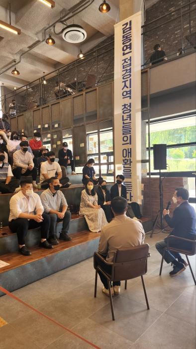 [한국뉴스타임=포천] 더불어민주당 김동연 경기도지사 후보는 포천시에 위치한 아트밸리 청년여행창고에 방문해 ‘접경지역 청년들의 애환을 듣다’ 간담회에 참석하였다.