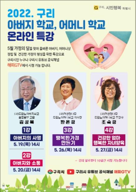 [한국뉴스타임=편집국] 구리시는 가정의 달을 맞아 5월 19일부터 27일까지 총 4회에 걸쳐 구리시 유튜브 공식채널인 해피GTV를 통해 '구리아버지학교, 어머니학교' 온라인 특강을 운영한다.