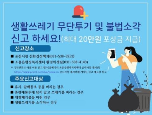 [한국뉴스타임=편집국] 포천시 소흘읍행정복지센터는 쓰레기 불법투기 행위 근절을 위해 기동단속반을 운영하고 ‘폐기물 위법행위 신고 포상금제도’를 집중 홍보한다.