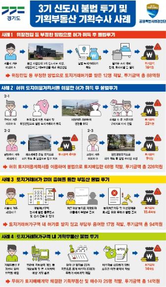 김영수 경기도 공정특별사법경찰단장은 18일 경기도청에서 기자회견을 열고 “올해 3월부터 3기 신도시 토지거래허가구역인 고양시와 남양주시 일대를 대상으로 무허가, 위장전입, 목적 외 사용 등 불법행위에 대해 기획수사를 실시해 불법 투기자 97명과 과천시 소재 임야에 대해 토지거래허가를 받지 않고 지분쪼개기 방법으로 매매하던 25명 등 불법 투기자 총 122명을 적발했다”고 밝혔다.