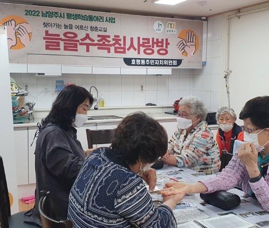 [한국뉴스타임=편집국] 남양주시 호평동 주민자치위원회와 늘을수족침사랑방 동아리는 지난 17일 찾아가는 늘을 어르신 청춘교실 상반기 운영을 주공20단지 경로당에서 시작했다고 밝혔다.