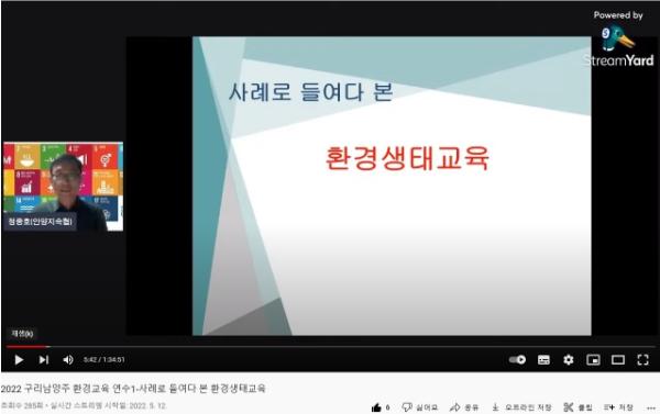 환경교육 연수는 2회차에 걸쳐 온라인으로 진행되었으며, 5월 12일에는 안양시 지속가능발전협의회 정종호(전 백운고 교사) 위원장이 ‘사례로 들여다 본 환경생태교육’을 주제로 학교에서 실천할 수 있는 환경생태교육 연수를 진행하였고, 학교에서 재직하면서 학생들과 실천했던 생태교육 운영 방법, 사례를 중심으로 연수를 진행하였다.