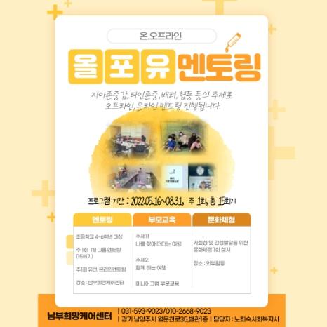남부희망케어센터 김기수 센터장은 “그동안의 비대면 교육으로 인해 학령기에 배워야 할 바른 인성, 자존감, 타인에 대한 배려 등의 가치 교육이 부족했던 실정”이라며 “올포유 멘토링을 통해 아동, 청소년들이 미래사회 꼭 필요한 인재로 성장하는 데 자양분이 되기를 바란다.”라고 전했다.