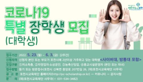 (재)포천시교육재단은 코로나19로 많은 어려움을 겪고 있는 지역 주민과 학생들의 경제적 부담 경감을 위해 지난해에 이어 올해도 ‘코로나19 특별 대학 장학생’을 모집한다.