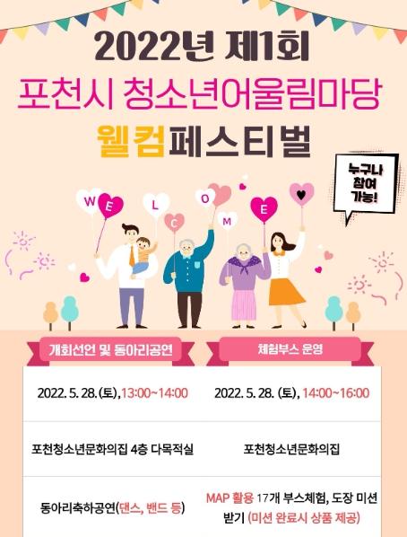 [한국뉴스타임=편집국] 포천시는 오는 28일 포천청소년문화의집에서 ‘2022년 제1회 포천시 청소년어울림마당 웰컴페스티벌’를 개최한다.